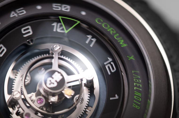 面盘外围有一枚刻度环,正面印有萤光绿色的CORUM x LABEL NOIR字样,以及0到60的刻度,搭配边框同为萤光绿色的三角形指标,佩戴者可以藉此判读出当前小时资讯。而再往陀飞轮靠近些还有零一枚刻度环,从上面的12个数字可知这是用来指示小时(也是要借助萤光绿色的三角形指标判读),LABEL NOIR交替运用炭灰和浅灰色点缀手表,而在灰色调的面盘上出现萤光绿色的指标,将能让人一目了然当前时刻,至于在泡泡表特色的拱形蓝宝石水晶镜面下,陀飞轮刚好就位在弧顶位置下方,无意间带有点放大效果,让人得以将陀飞轮的自转动态看得更清楚。