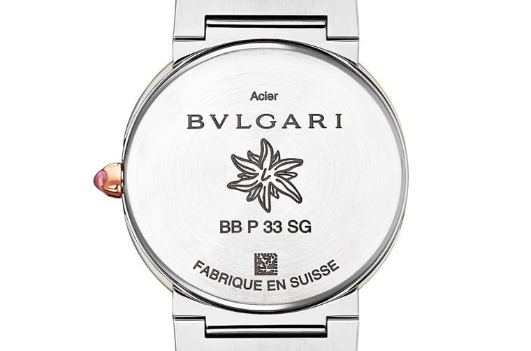 从手表正面看不太出来有Lisa联名的元素,必须要翻到表背才能窥见端倪,宝格丽将Lisa指定的花种——来自阿尔卑斯山高山的雪绒花作为她个人专属Logo元素,雪绒花图案中再加上一个代表Lisa的字母”L”,以这个专属图腾传达Lisa向宝格丽制表工艺致敬之意,以及她相当享受参与这项联名表企划的经验;同样的Lisa雪绒花Logo也会出现在手表的表盒内,且此处还多压印Lisa的签名字样,突显联名意义以及手表限量发行的纪念价值。值得注意的是,Bvlgari Bvlgari x Lisa限量款分别有33mm与23mm两种表径版本,两款表皆搭载石英机芯,设计则是如出一辙,比较明显的差异大概是限量数的分别,想要入手的人可得多多留意。